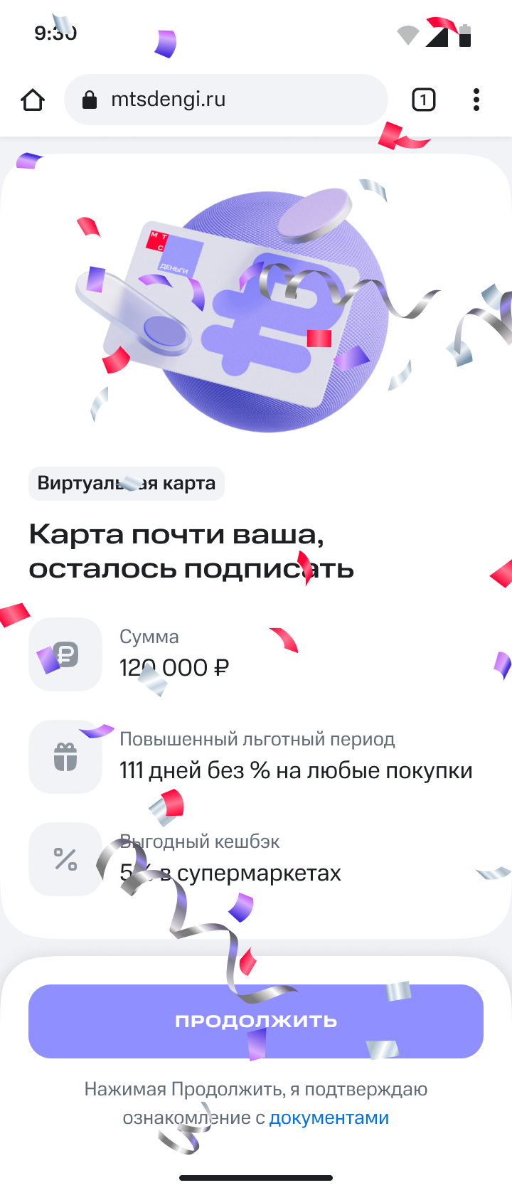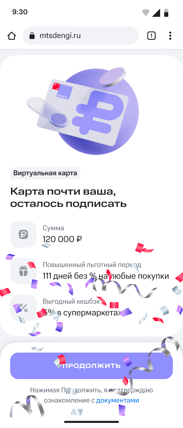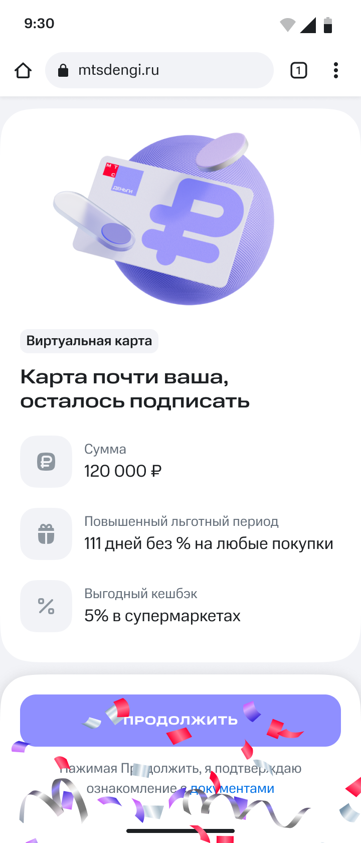 Взятие кредитных обязательств — стресс. Поэтому мы хотим поздравлять пользователей, получивших одобрение по кредитке, разработав на экране подписания карты анимацию конфетти, чтобы порадовать и постараться снять тот самый стресс, расслабить и тем самым потенциально увеличить коверсию в подписание карты.