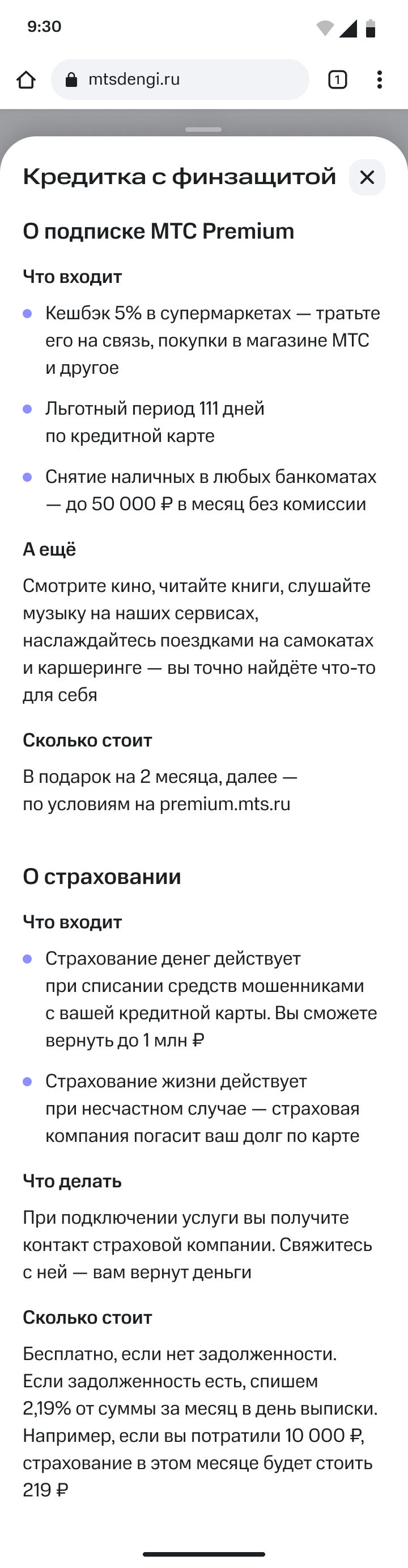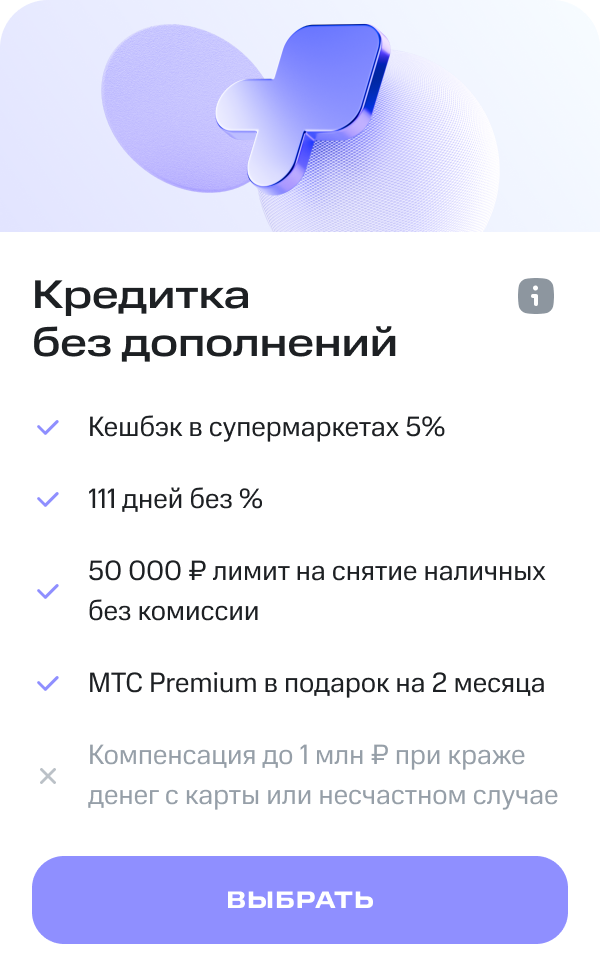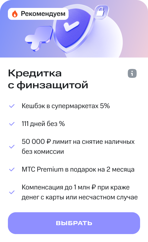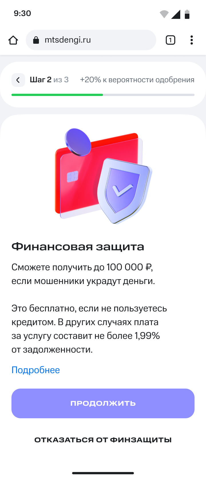 Два понятных варианта: «Кредитка с финзащитой» и «Кредитка без дополнений». Пользователь видит одинаковые базовые возможности карты и дополнительную ценность от страховки, описанную простыми словами: «списали деньги мошенники — вернёте до 1 млн ₽», «несчастный случай — страховая погасит долг по карте», «Выбор можно изменить в любой момент» — снимает страх «зафиксироваться навсегда», повышает вероятность подключения страховок.