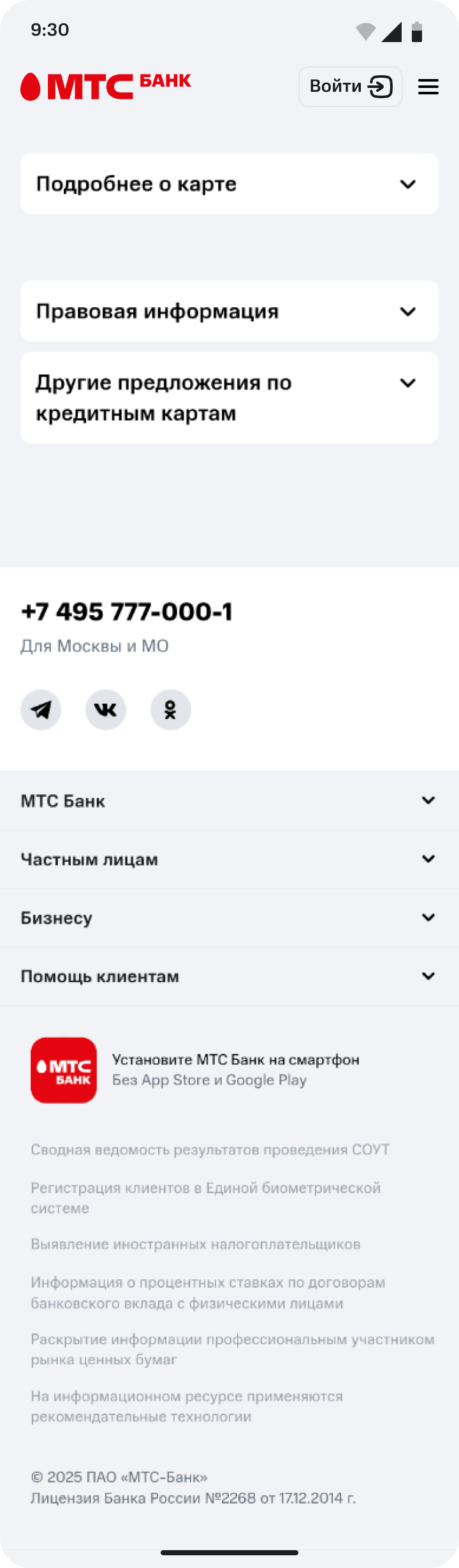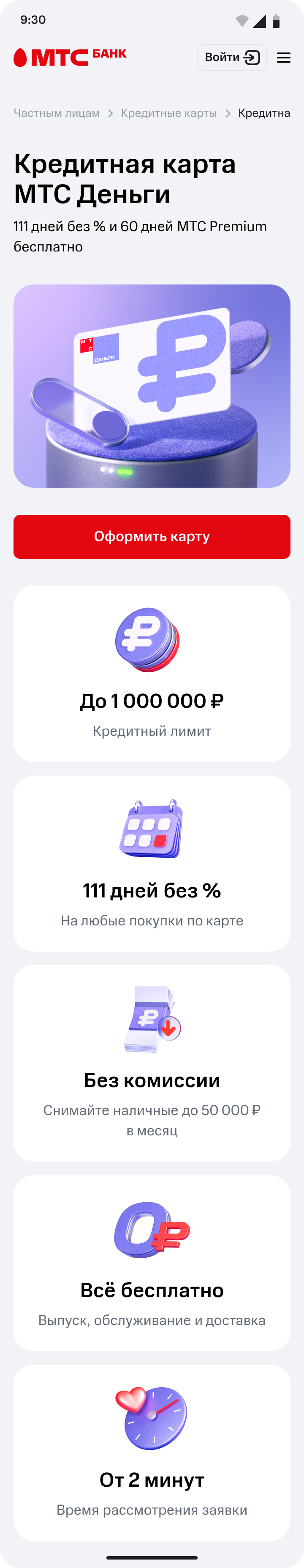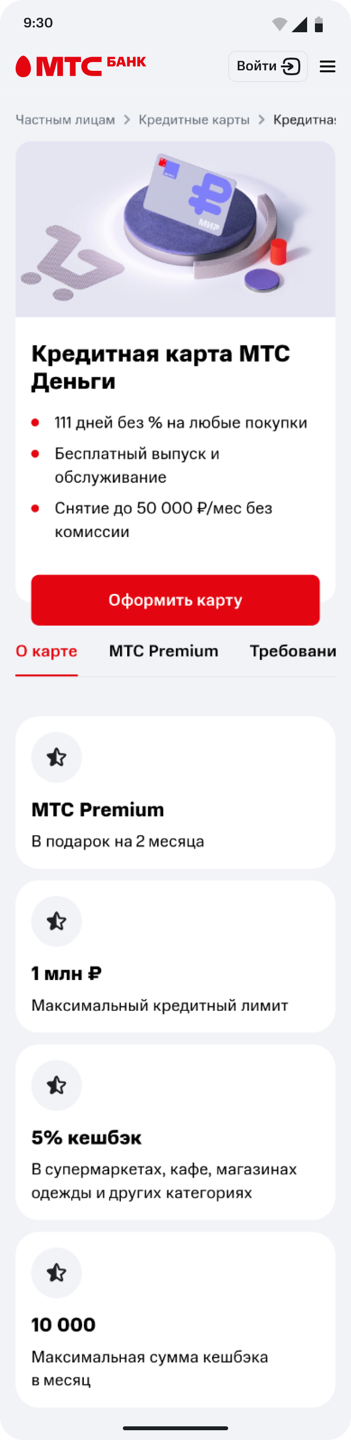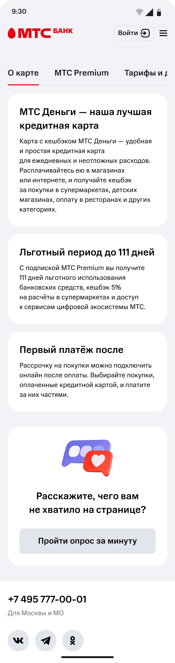 Текущий лендинг кредитной карты МТС Деньги на сайте МТС Банка устарел с точки зрения UI и UX, структуры страницы и сторителинга, текстов. Также он собран на фабрике лендингов, что закрывает нам возможности для изменений. Поэтому мы решили его пересобрать.