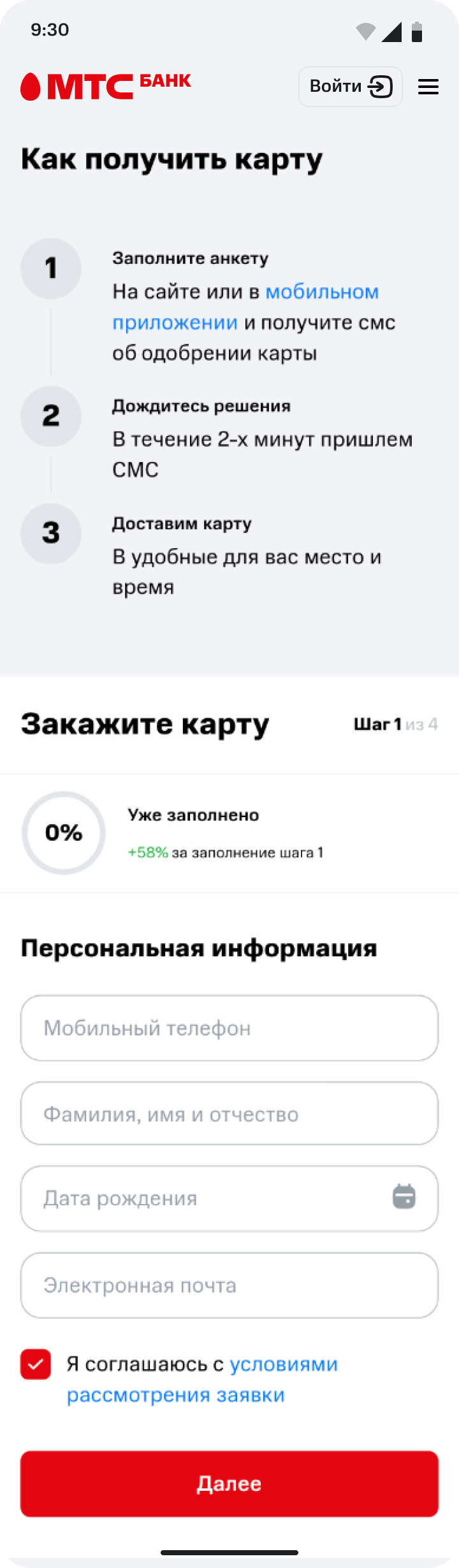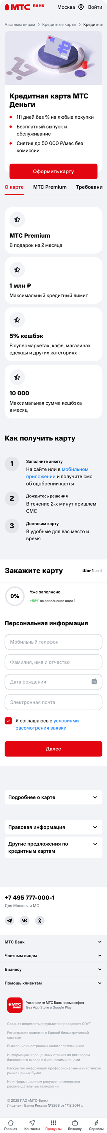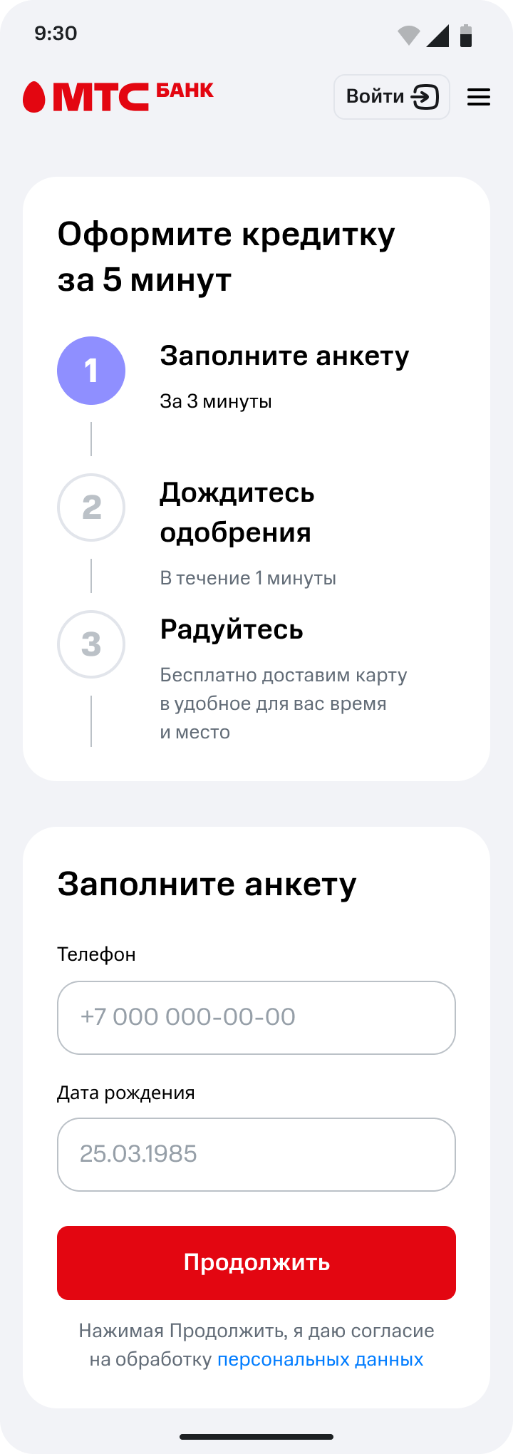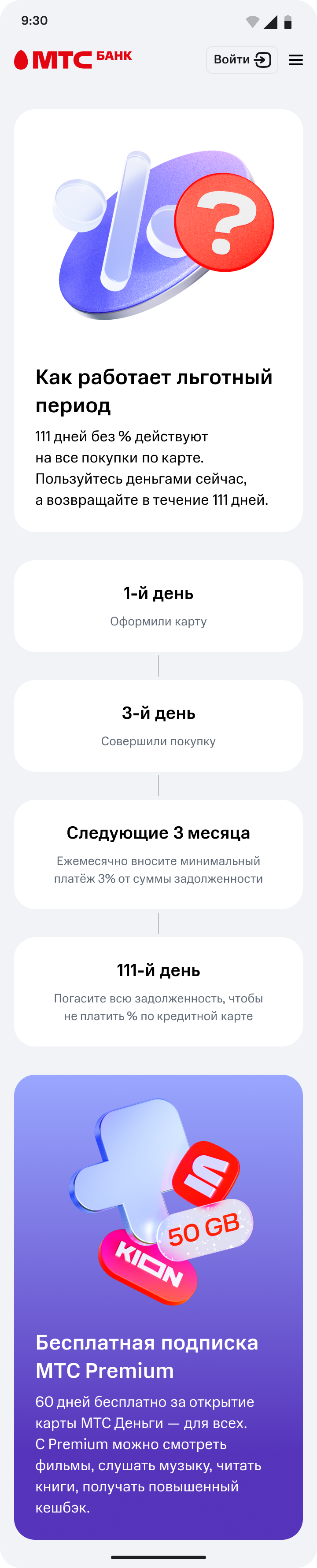 Текущий лендинг кредитной карты МТС Деньги на сайте МТС Банка устарел с точки зрения UI и UX, структуры страницы и сторителинга, текстов. Также он собран на фабрике лендингов, что закрывает нам возможности для изменений. Поэтому мы решили его пересобрать.
