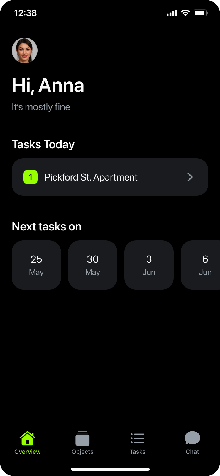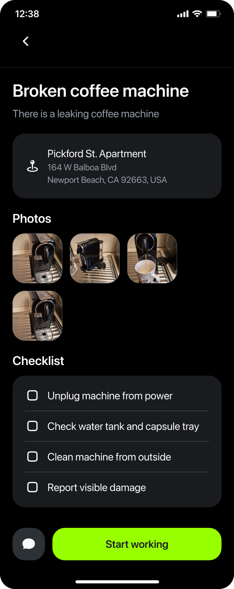Работа с задачей со стороны персонала. Для примера показал экраны в тёмной теме, так как она также была разработана в рамках работы над проектом. Как работает: клинер заходит в приложение, с главной проваливается в список задач, выбирает задачу, сканирует QR-код, чтобы зафиксировать начало работы, далее по чек-листу всё выполняет, прикрепляет фото/видео и всё, довольный идёт отдыхать или открывает следующую задачу.
