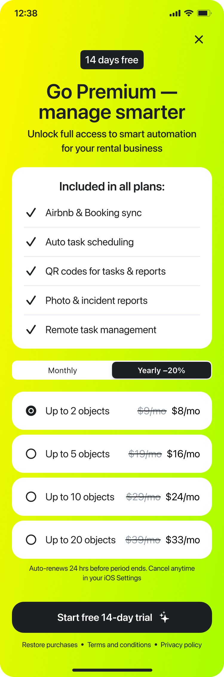 Добавление нового объекта и его настройка по ряду параметров: тип, название и адрес, расписание уборки, интеграция с календарём бронирований и т.д.
