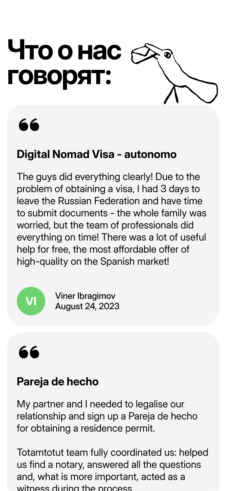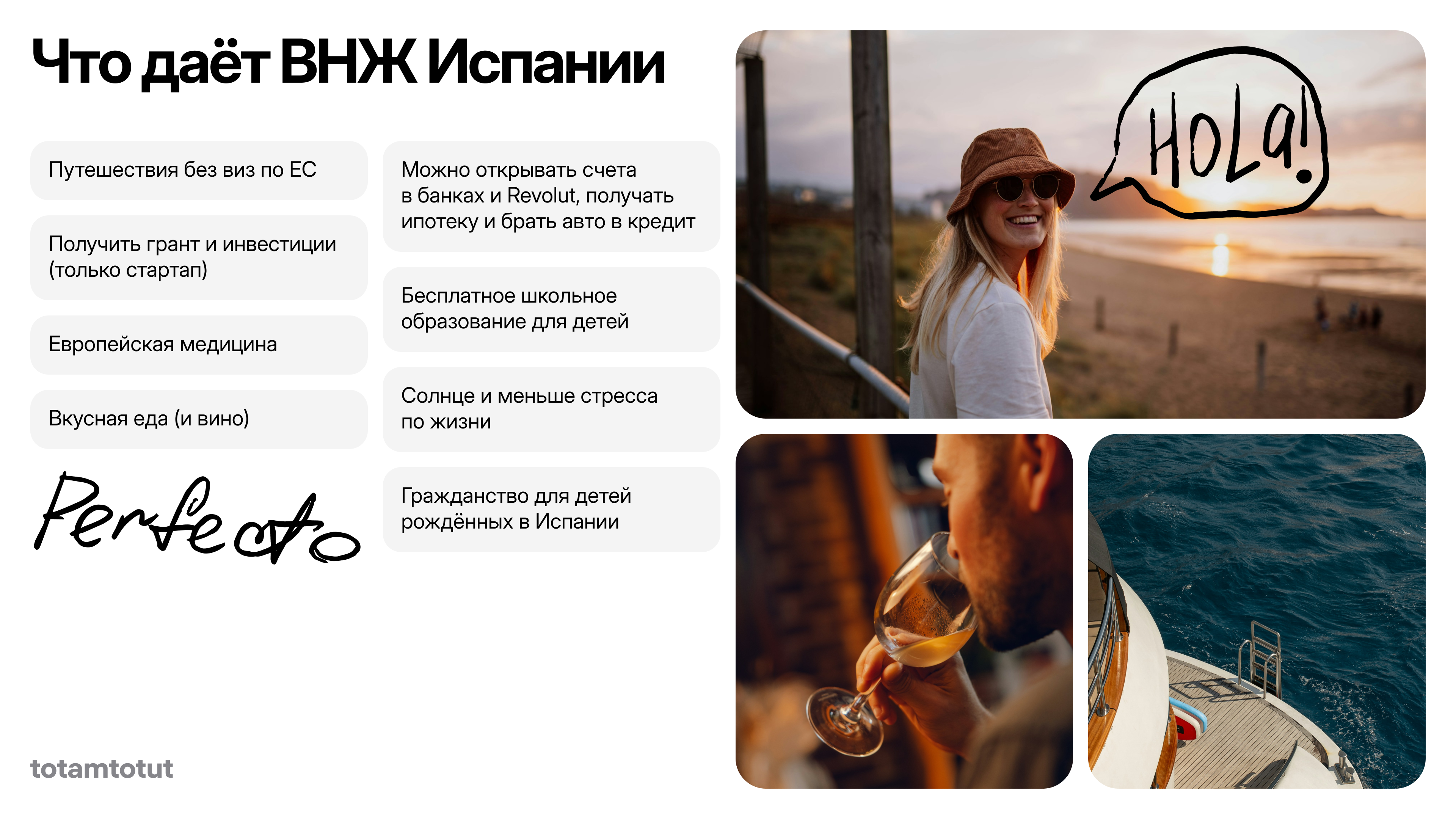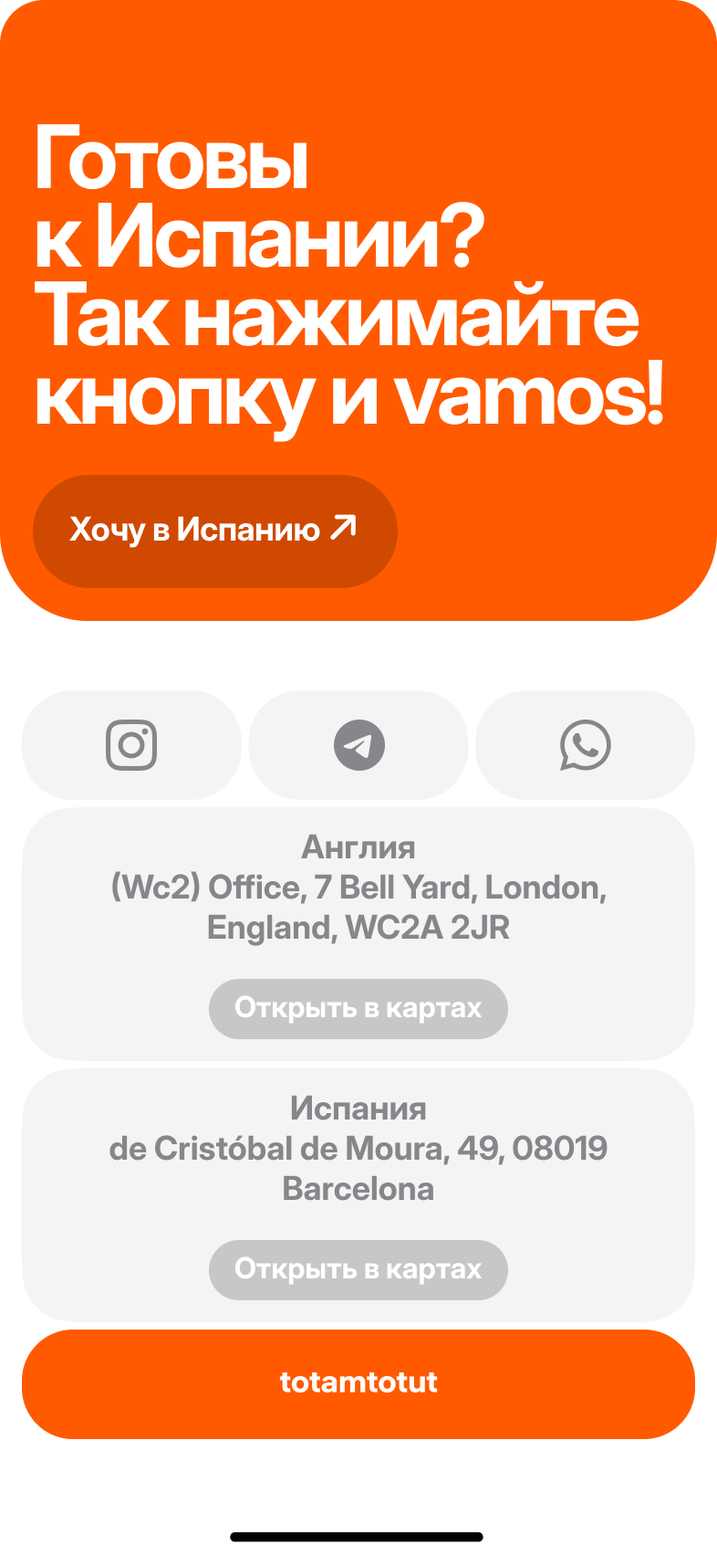 Totamtotut — сервис по сопровождению релокации в Европу (Испанию и Португалию). Компания помогает клиентам оформлять визы Digital Nomad, Startup и Student Residence, искать жильё, консультирует по налогам и бытовым вопросам.